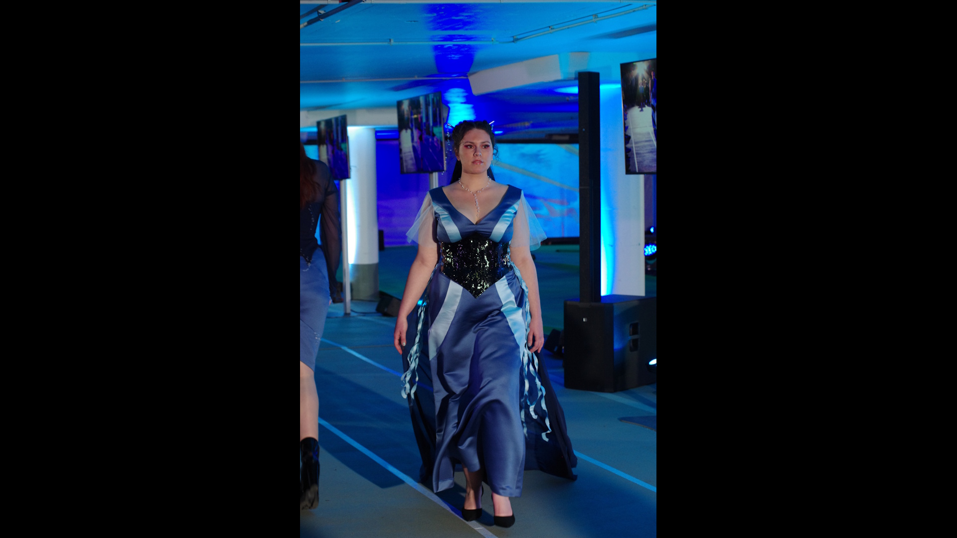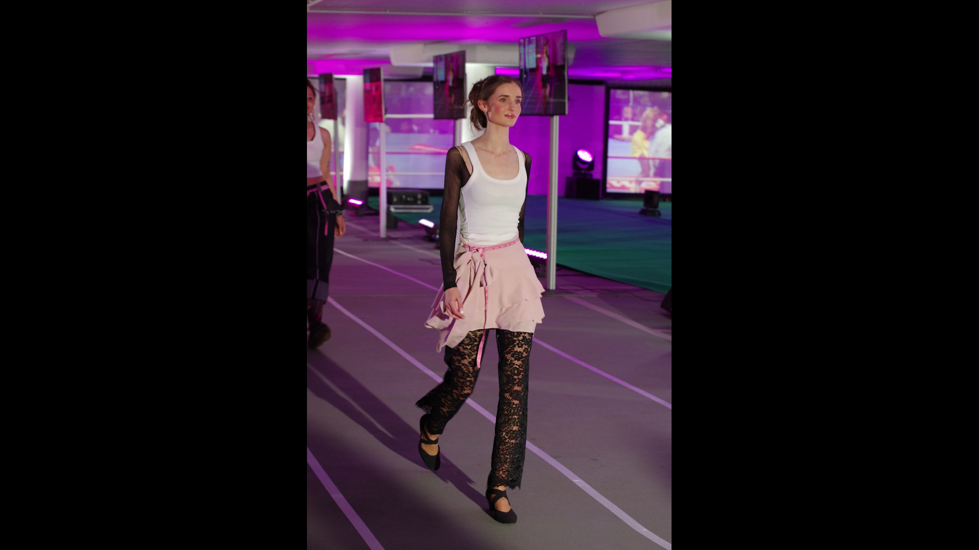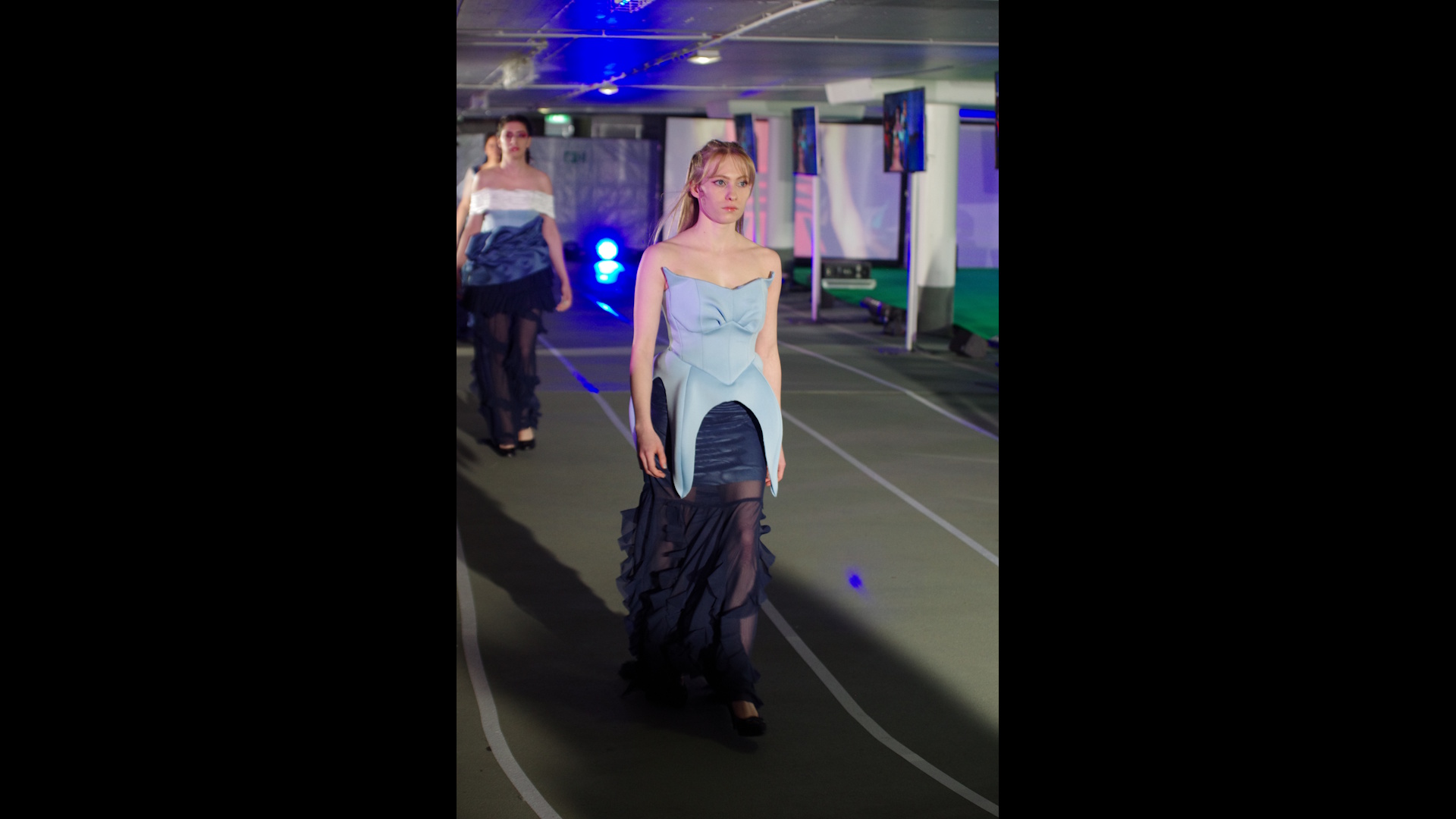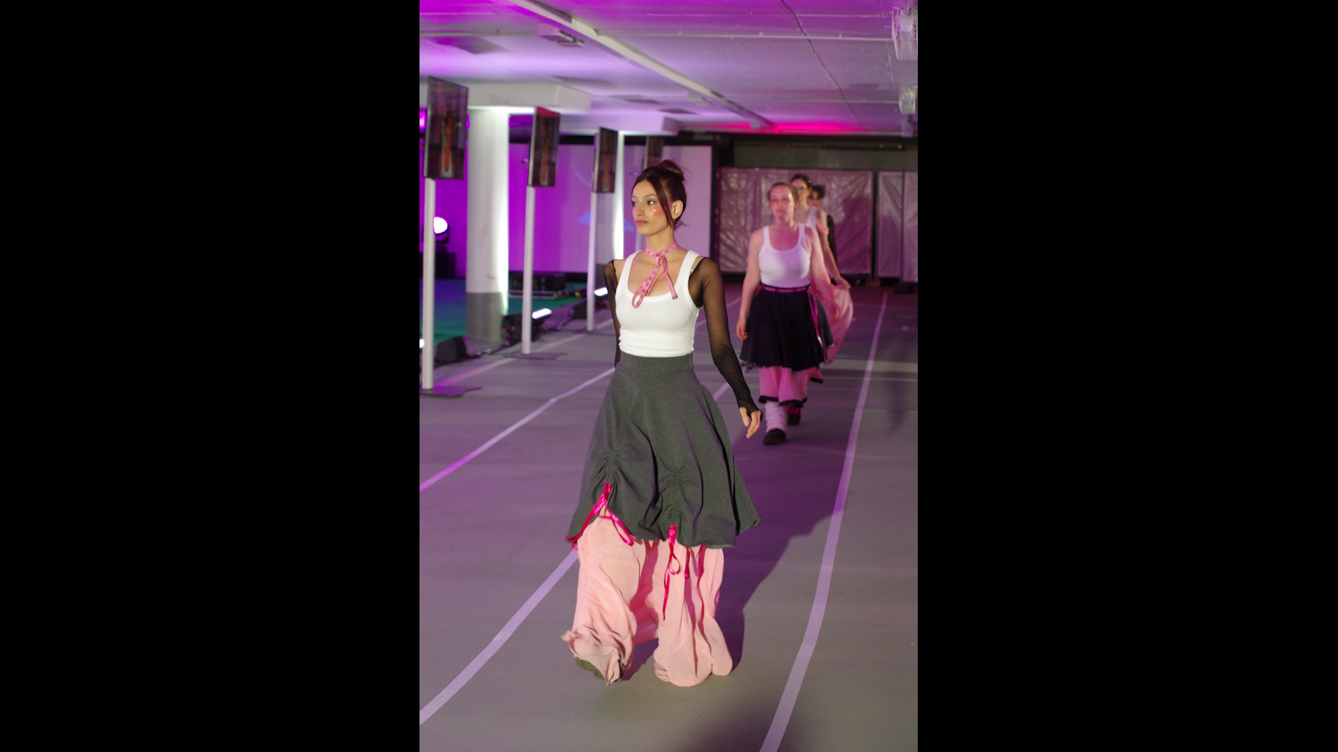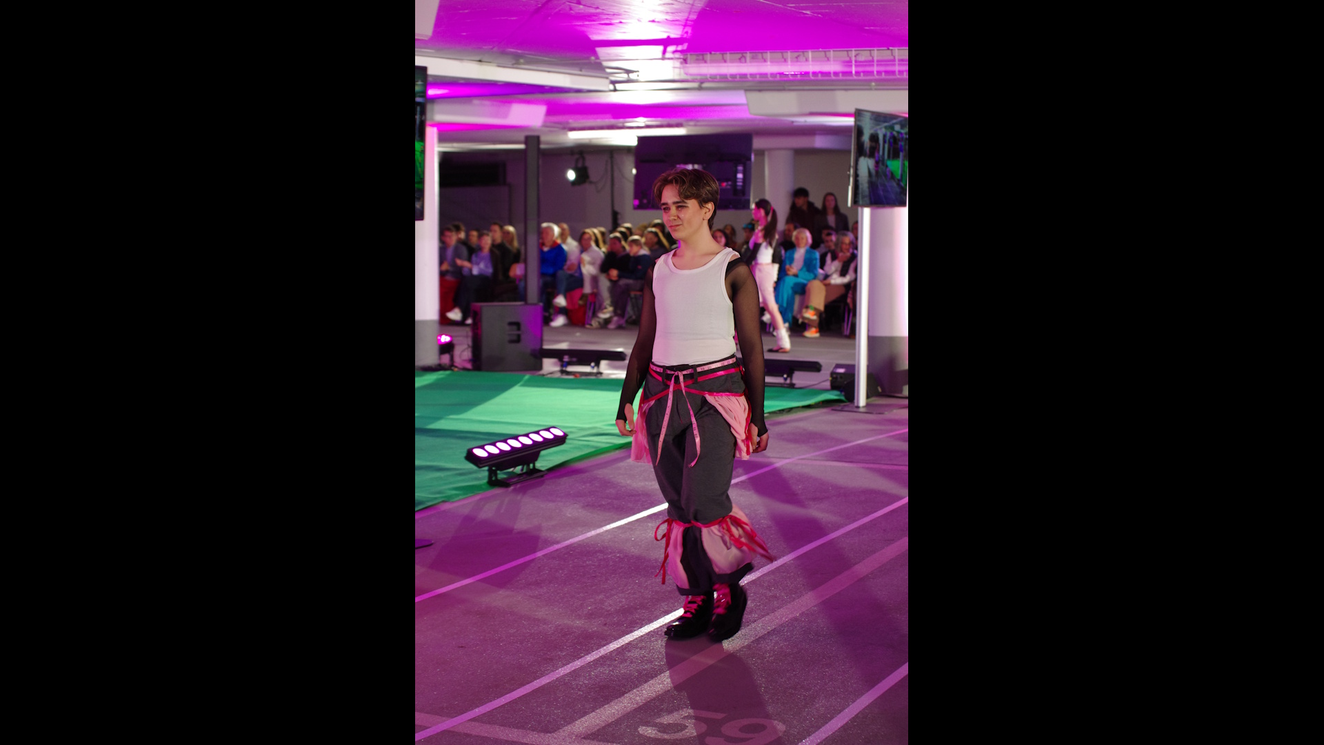 Verschiedene Sportdisziplinen und deren Spannungsfeld zwischen Funktion und Ästhetik sind Inspirationsquelle für die Modeentwürfe der Schülerinnen und Schüler. Dabei greifen die Schnittführungen der Silhouetten die Dynamik der unterschiedlichen Sportarten auf. Modekreationen zu sechs Bildern: Attitude - Ballett, Immerse - Schwimmsport, En Garde - Fechten, Avalanche - Wintersport, Knockout - Boxen, Hail Mary - Football und Balance of Performance - Motorsport, fantasievoll entworfen und selbstgeschneidert für eine Welt, die oft von Leistungsdruck und Schnelllebigkeit geprägt ist. Jeder Look erzählt eine Geschichte von Identität, Durchhaltevermögen und der Kraft, anders zu sein. Cooler Streetstyle, funktional, anpassungsfähig und komfortabel, erweitert den Blick auf traditionelle Dresscodes.
